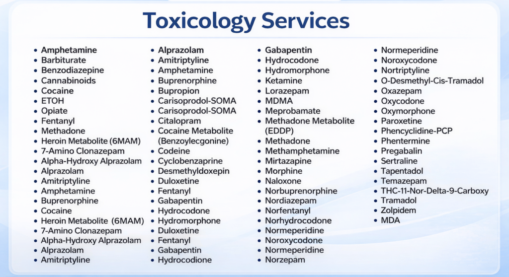 We offer a comprehensive range of toxicology services, including routine drug screening, confirmatory testing, specialized panels for pain management, employment screening, and clinical monitoring. Our advanced testing methods ensure accurate and reliable results.